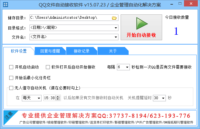 QQ文件自動(dòng)接收管家是基于騰訊QQ開發(fā)的第三方QQ輔助軟件。QQ接收秘書可同時(shí)接收QQ好友發(fā)來多個(gè)文件和多個(gè)QQ多個(gè)好友發(fā)來的圖文/照片等文件/文件夾,文件接收時(shí)不影響正常的鼠標(biāo)、鍵盤操作,并自動(dòng)歸類、回復(fù)。當(dāng)您外出或不在電腦旁的時(shí)候開啟該軟件,該軟件會(huì)為您全自動(dòng)接收客戶發(fā)來圖文,避免您接收不到客戶文件的煩惱。如在電腦旁也可開啟該軟件省時(shí)、省力,最大限度地提高工作效率、節(jié)省等待時(shí)間!